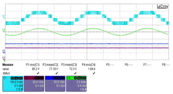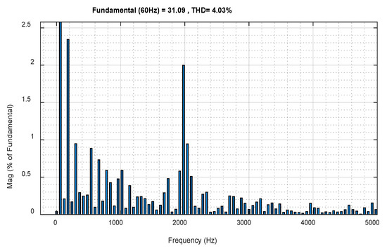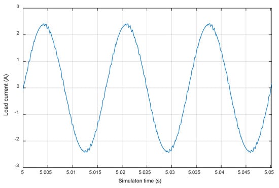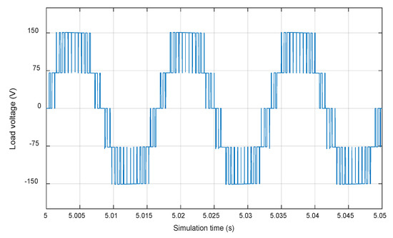 The load voltage is constituted of five levels as follows: +Vdc, +Vdc/2, 0, −Vdc/2 and −Vdc as depicted in Figure 8. Hence, the waveform of the load current is approximately sinusoidal as presented in Figure 9.