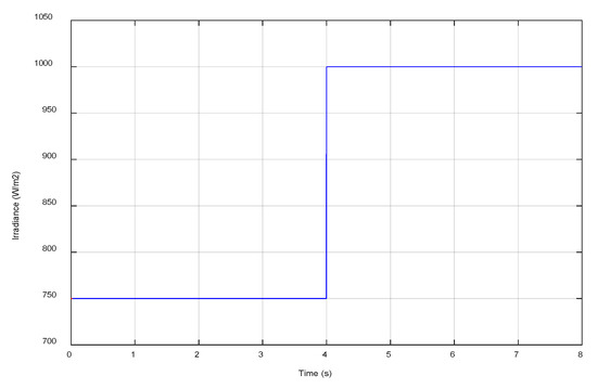 The proposed system is simulated under a constant temperature value of 25 °C and different levels of irradiation, as shown in Figure 10, to insure the efficiency and accuracy of the used INC technique. The simulation began with 750 W/m2 until t = 4 s, then continued with 1000 W/m2 of irradiation.
