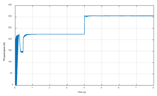 Figure 11 shows the evolution of the PV panel power. It is at the maximum values for both levels of irradiation (around 225 W for 750 W/m2 and 305 W for 1000 W/m2). This is consistent with the characteristics curves of the PV module presented in Figure 4, which shows the accuracy and efficiency of the used INC algorithm.
