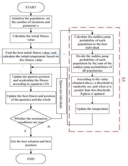 Step7: Calculate the optimal fitness value after each update, update the temperature of the simulated annealing algorithm. Output the optimal particles after meeting the conditions of the number of iterations or convergence accuracy.