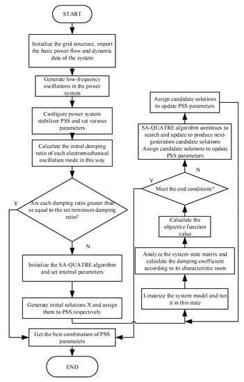 Flow chart of optimizing PSS parameters by SA-QUATRE algorithm.