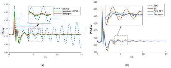After a small disturbance is applied, the power on the tie-line between the two regions of the system will increase and oscillate. If it is not suppressed, the system will be seriously destabilized. Under the PSS parameters under the system default parameter configuration, that is, when the unoptimized PSS is applied, the power oscillation is suppressed to a greater extent than when the PSS is not installed, but the time required is about 13 s. The PSS, under the coordinated design of SA-QUATRE, can effectively calm down in the early stage of oscillation and reflect the rapidity of this method. From Figure 7 and Figure 8, we can also see that, in comparison with other methods, before the oscillation is basically subsided, the overall amplitude of the PSS optimized by the method in this paper is more minor. In Figure 7a, you can see that under the traditional lead-lag compensators phase compensation setting, the power oscillation amplitude of the PSS appears as a local downdraft at 3~4 s, indicating that the overshoot is too large and the system damping is relatively tiny. This phenomenon is effectively alleviated after optimization. In summary, the PSS parameters and suppression effect designed by the algorithm in this paper are more superior.