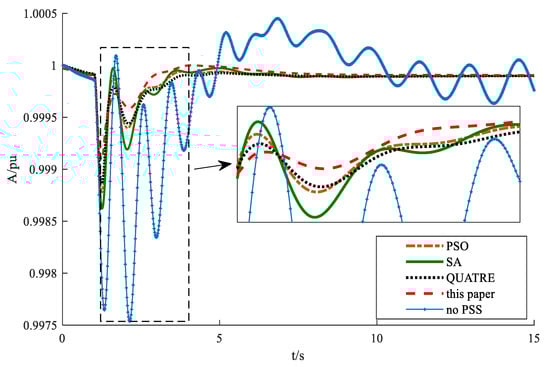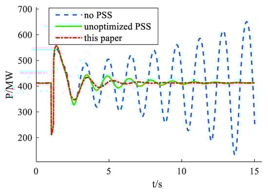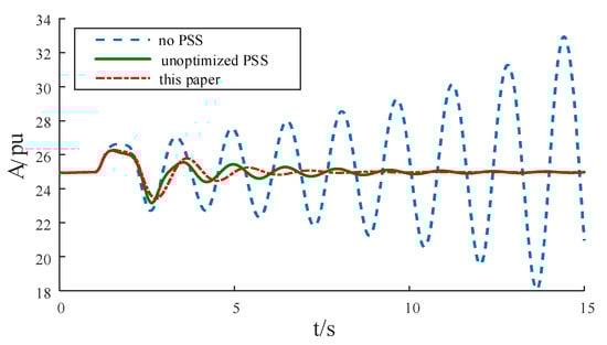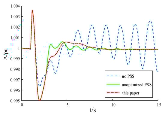 In the case of this large disturbance, the system has an amplitude-enhancing oscillation, and the PSS adjusted by the traditional phase compensation method is adopted. Although it can attenuate the oscillation to balance within a certain period of time, it is slightly inferior in speed and amplitude compared to the coordinated design method proposed in this article. The power system stabilizer optimized in this paper can effectively suppress it quickly, and the overall amplitude of the oscillation is smaller in the early stage of oscillation. Table 6 shows the various electromechanical modes of the system with the power system stabilizer designed by this method and without PSS. The table shows that in this disturbance operation state, a negative damping mode will be generated when the stabilizer is not configured, which threatens the system’s stable operation. After inputting the PSS tuned by the method proposed in this paper, not only is the negative damping of the dominant oscillation mode increased to the positive damping, but the damping of the other two modes is also enhanced at the same time.