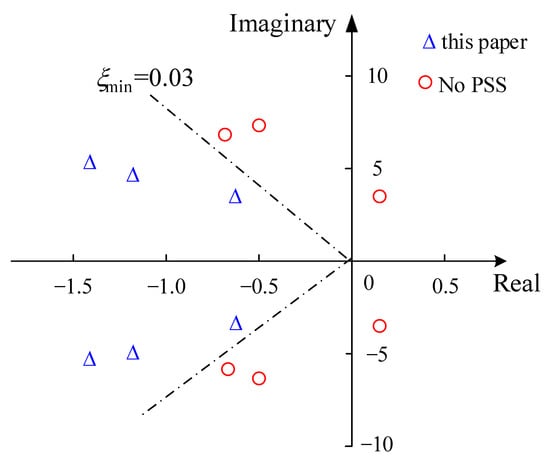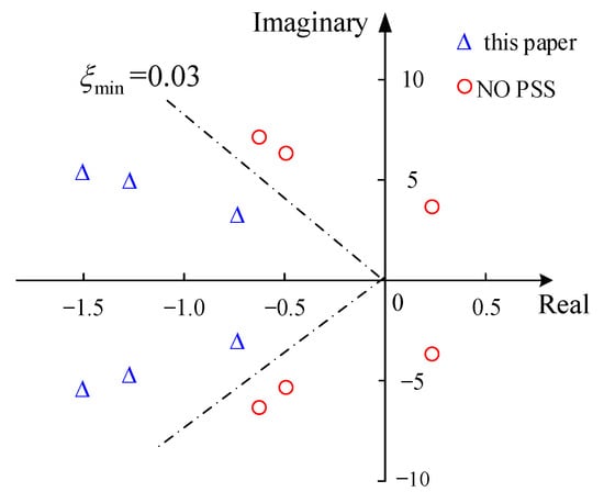 The main objective of this paper is to maximize the damping ratio by moving the eigenvalues of the system to the left of the imaginary axis. From the characteristic distribution of electromechanical mode in Figure 14, it can be seen clearly and intuitively that the coordinated design of PSS using the method in this paper can also achieve the goal and effectively improve the system’s stability in a large disturbance state.