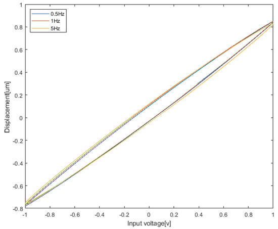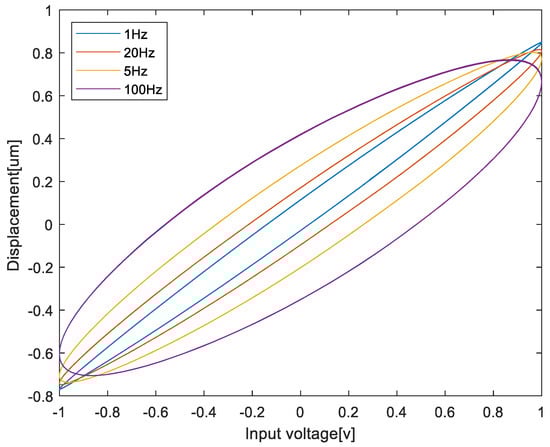 The hysteresis nonlinearity of PEA comprise very complex nonlinearities, which usually manifest as rate dependence and multi-valued mapping [4], as shown in Figure 1. From the figure, we can observe that when sine signals with the same voltage and different frequencies are applied to the PEA, its hysteresis model will change with the frequency. Currently, some scholars have conducted substantial research on the hysteresis nonlinear modeling of PEA, and mainstream modeling approaches can be classified into three types. The first one is a physical model based on the physical characteristics of piezoelectric materials, such as the Bouc–Wen model [5] and Duhem model [6]. This model is a “white-box” model based on actual physical phenomena and physical laws; thus, the model relies too much on specific physical laws and is not practical. The second type of model comprises phenomenological models based on input and output data, for instance, the Preisach model [7] and the Prandtl–Ishlinskii model [8]. This model is a “black box” model of a system based on the actual input and output data; thus, this type of system is not limited by physical characteristics. The last type of model comprises intelligent models based on various intelligent algorithms, such as the T-S fuzzy model [9]. For this type of model, intelligent algorithms are used to train the model in order to meet constraints and obtain an accurate model of the system.