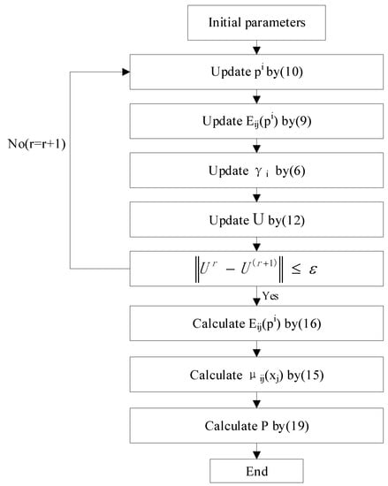- The number of initial clustering models c, fuzzy weighted index m, and iteration termination threshold : Generate initial membership matrix . Set the iteration counter as r = 1.