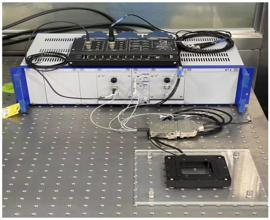 The experimental equipment of the PEA data acquisition experiment includes hardware and software systems. The hardware system includes a computer, a Piezo nano-positioning device, a data-acquisition card, and an integrated drive controller, as shown in Figure 4. The Piezo nano-positioning device used in the experiment is the P-733.2CD model from the Physik Instrument (PI) company, Karlsruhe, Germany. which has integrated displacement sensors that can directly measure output displacements. The data-acquisition card is a PCI-6251 produced by NI Company, Texas, America, Un which does not need to write additional driver programs and can be directly connected to the device. The integrated drive controller is an E-509.C2A dual-axis drive controller from PI, which contains a voltage amplifier module to drive the PEA. The software system uses the Matlab2020a(Math-Works company, Natick, United States) program preinstalled in the Win10 environment. The initial signal of the experiment is generated by MATLAB software in the computer and transmitted to the integrated drive controller across the data-acquisition card. The voltage signal processed by the driving controller can be used as the driving voltage of the Piezo nano-positioning device. After receiving the voltage signal, the Piezo nano-positioning device outputs the corresponding displacement, and the displacement signal is fed back to the computer across the data-acquisition card.