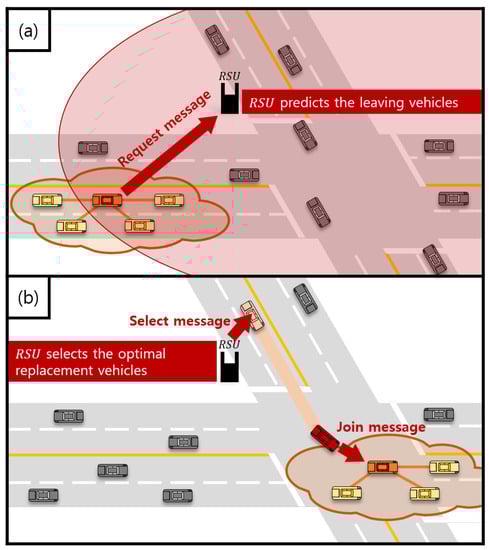The network model and scheme overview: (a) when a vehicular cloud enters into the communication coverage of a RSU, the requester vehicle sends a request message to the RSU to carry out the member vehicle replacement, and (b) the RSU selects the optimal replacement vehicles, and the vehicular cloud is reconstructed with the optimal replacement vehicles.
