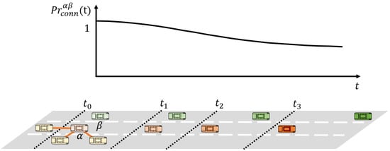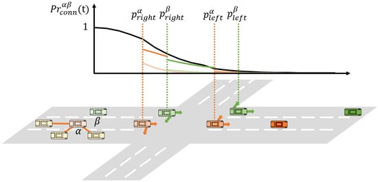 Thus, the probability that the distance between vehicle and vehicle is less than the communication range is calculated differently depending on the s-th path among S paths. The expected connection probability between the two vehicles at time considering the trajectory probability of each vehicle is denoted using the cumulative distribution function (CDF) as follows:
