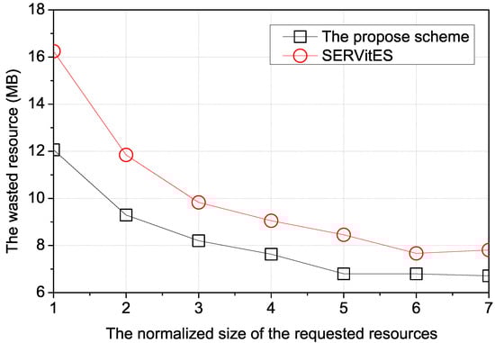 To evaluate the performance of the proposed scheme and SERVitES, we compared two performance values of these schemes according to three environment values. The three environment values are the normalized size of the requested resources, the density of vehicles, and the average speed of the vehicles. The normalized size of the requested resources is the ratio of the requested resource size to the average available resource size of one vehicle. It denotes that the normalized size is 1 if the requested resource size is the same as the average available resource size of one vehicle. When the requested resource is large, the vehicular cloud is easily destroyed and reconstructed frequently by the unstable connectivity between vehicles. Accordingly, the total provision resource of the vehicular cloud is constructed closer to the requested resource due to continuous reconstruction. The density of vehicles is the number of vehicles in the 1 km × 1 km network area. If the density of vehicles is high, it denotes that there are enough candidate vehicles to reconstruct the vehicular cloud. In the dense vehicle case of the proposed scheme, the vehicular cloud can select the optimal candidate vehicle as a replacement vehicle in terms of saving the wasted resources and stabilizing the connectivity between vehicles. The average speed of vehicles is the average of the vehicle’s speed based on the determined acceleration by the Gaussian distribution every second from the start of the simulation in the entire network area. Since it directly affects the connectivity between vehicles, the vehicular cloud frequently requests reconstruction when vehicles are fast. In a not-dense vehicle environment, the frequent reconstruction of the vehicular cloud reduces the quality of service because there are not enough candidate vehicles to select the optimal replacement vehicle, and vehicles have unstable connectivity.