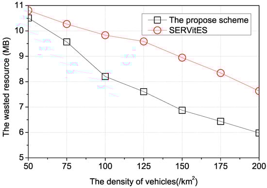 Figure 5 shows the wasted resources according to the density of vehicles. When the density of vehicles is high, the requester vehicle and the RSU can use more vehicles to construct or to reconstruct the vehicular cloud. If the vehicles that can be member vehicles are adequate, the vehicular cloud can select better member vehicles. SERVitES only considers the largest size of the available resource and the connectivity between vehicles. In SERVitES, if the vehicles are dense, there is a high probability of finding a few member vehicles with large amounts of resources instead of many member vehicles with small amounts of resources. This has unintentionally led to the saving of the wasted resource. In the proposed scheme, if the vehicles are dense, there are more candidate vehicles to be used to construct or to reconstruct the vehicular cloud by optimizing the wasted resources. Therefore, more optimal candidate vehicles can be chosen as member vehicles of the vehicular cloud. That is the reason that the proposed scheme has less wasted resource than SERVitES.
