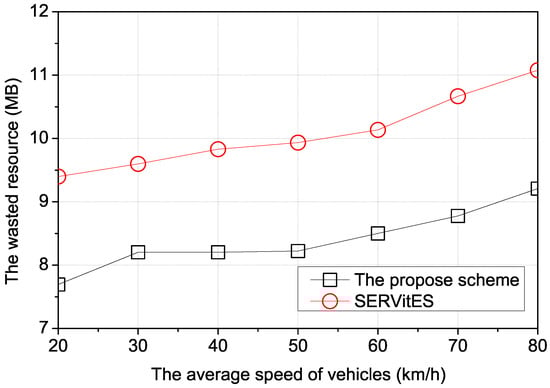 Figure 6 shows the wasted resources according to the average speed of vehicles. Since fast vehicles suffer more intersections and may leave the vehicular cloud, their vehicular clouds need to be reconstructed more due to the low connectivity between vehicles. To reconstruct the vehicular cloud, it is necessary to find another member vehicle instead of the leaving member vehicle that was optimally chosen. This causes an increase in wasted resources because it may cause all the best members to get out and the worst members to be picked. In SERVitES, more reconstruction of the vehicular cloud has a high probability that the vehicular cloud chooses a vehicle with more available resources as a member vehicle. When frequently changing the member vehicles of the vehicular cloud, the vehicular cloud selects the vehicle with more available resources as a member vehicle, and thus, the wasted resources will be increased. In the proposed scheme, the RSU selects the vehicle that best minimizes the wasted resources as a member vehicle. When vehicles are slow, the optimally selected member vehicle of the vehicular cloud maintains its cloud longer. Thus, the proposed scheme has fewer wasted resources than SERVitES.