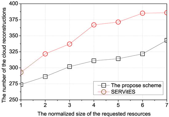 Figure 7 shows the number of cloud reconstructions according to the normalized size of the requested resources. When the size of the requested resource is large, the vehicular cloud needs more member vehicles to maintain itself. If the vehicular cloud includes many member vehicles, the probability that one member vehicle leaves the vehicular cloud is increased. In that case, since the vehicular cloud is destroyed by leaving member vehicles, the vehicular cloud needs to be reconstructed. Thus, if the size of the requested resource is large, the reconstruction of the vehicular cloud frequently occurs due to the high probability of leaving member vehicles. In SERVitES, the vehicle with the largest amount of available resources is selected as the member vehicle of the vehicular cloud based on the current speed of the vehicle. The connectivity between vehicles is very unstable because the vehicles can change their speed and direction in the network area. This leads to an increased number of reconstructions necessary for the vehicular cloud. In the proposed scheme, the prediction of the connection between the member vehicles is more accurate than SERVitES because the RSU considers the connectivity between vehicles. Therefore, the proposed scheme has a more stable connection compared with SERVitES.