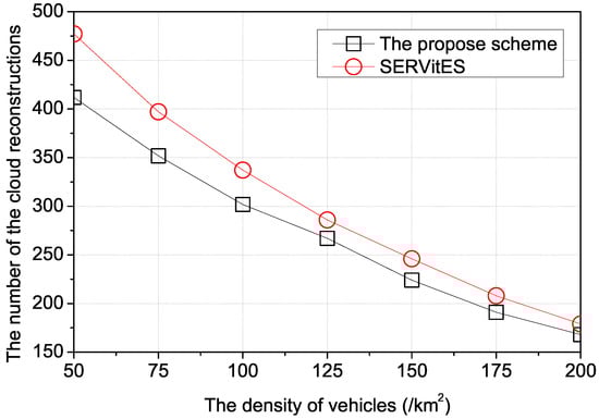 Figure 8 shows the number of the cloud reconstructions according to the density of vehicles. If the density of vehicles is high, the vehicular cloud can choose the best member vehicles to construct the vehicular cloud in terms of connectivity because there are more candidate vehicles that can be member vehicles. Thus, when vehicles are dense, the member vehicles hardly leave the vehicular cloud because of enough candidate vehicles. In SERVitES, the requester vehicle considers the connectivity between itself and the candidate vehicles to receive the largest amount of resources. The number of the cloud reconstructions is reduced because the requester can select the vehicles that have good connectivity to the requester vehicle and large available resources when vehicles are dense. In the proposed scheme, using a more accurate prediction of vehicle mobility, the RSU can allocate the replacement vehicle with the optimized connectivity to the requester vehicle to reconstruct the vehicular cloud. Accordingly, the proposed scheme has fewer requests for the reconstruction of vehicular clouds than SERVitES.