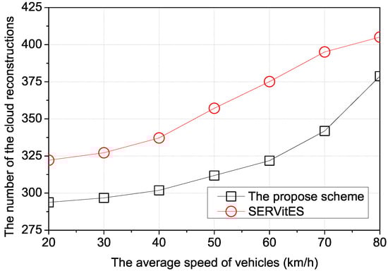 Figure 9 shows the number of the cloud reconstructions according to the average speed of vehicles. When vehicles are fast, the connection time between vehicles is reduced due to suffering more intersections and leaving the vehicular cloud quickly. The vehicular cloud needs time to maintain the connection among member vehicles to provide the available resources to the requester vehicle. During the needed time, the vehicular cloud needs more reconstruction to maintain it due to the increased disconnection between vehicles. In SERVitES, the requester vehicle tries to maintain the vehicular cloud by searching for a replacement vehicle in the V2V communication range. Due to the relatively short range of communication, the number of candidate vehicles is not adequate to select the best member vehicles in terms of the connectivity. In the proposed scheme, the vehicular cloud can replace its leaving member vehicles with the replacement vehicles using the V2I communication range. Due to the relatively long range of communication, the number of candidate vehicles is adequate to select the optimized member vehicles in terms of connectivity and saving wasted resources. For this reason, the proposed scheme has fewer instances of cloud reconstruction according to the average speed of vehicles.