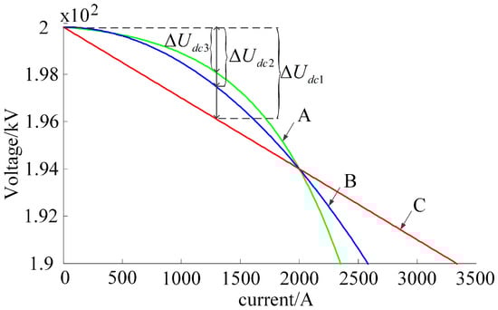 - As shown in Figure 2, adaptive exponential droop control (A), adaptive droop control (B) [26], and the traditional droop control (C) are compared through a curve diagram, and it is easy to see that the deviation of DC voltage is slighty better for the adaptive droop control than the adaptive exponential droop control in a small range; however, the voltage deviation of the exponential droop control is better than that of the adaptive droop control in a large variation range.