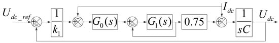 Figure 3 shows a control block diagram of the adaptive exponential droop control converter, in which the droop coefficient k1 = −k is taken, and the droop control outer loop PI controller is . The current inner loop function is set as : is the current inner loop control PI controller; is the current inner loop sampling transfer function, where is the PWM equivalent gain and is the sampling period; and is the transfer function of the AC filter resistance and inductance link. The equivalent proportional gain is 0.75 and the DC side capacitance transfer function is .