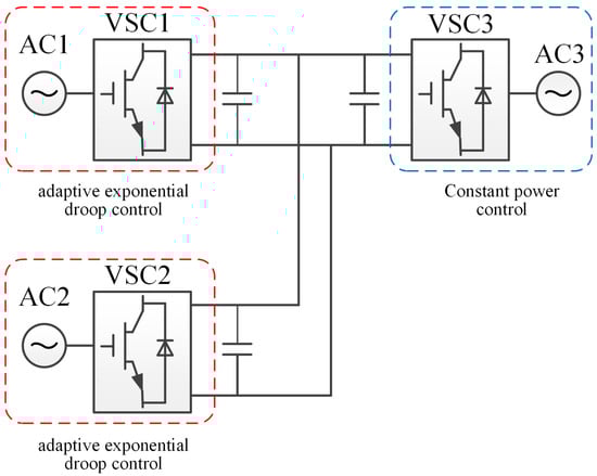 The voltage source converter multi-terminal DC (VSC-MTDC) system, which is composed of multiple VSC converter stations and DC grids, can easily realize multi-power supply and multi-load power supply, has strong flexibility, and is economical and reliabile. Therefore, this system is a hot research and engineering topic in the areas of large-scale renewable energy grid connection, interconnection between energy systems, and island power supply [1,2,3,4,5]. In recent years, with the rapid development of power electronics technology, research on the VSC-MTDC system has deepened [6,7,8,9], but the current research is mainly aimed at optimizing its stability and power quality. When the distribution network fails to maintain the stability of grid voltage, the system can quickly provide active and reactive power support [10,11,12]. When the active power is unbalanced in the DC network of the system and the fluctuation of the DC side voltage is large, the dynamic response process of the control strategy will activate the protection device to stop the equipment, which will then lead to economic losses. Therefore, it is particularly important to study the control of the DC side voltage of VSC-MTDC, and to improve its power distribution and voltage fluctuation characteristics during faults or disturbances.