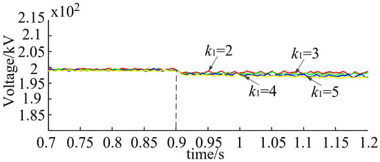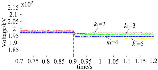 To verify the superiority of the proposed adaptive exponential droop strategy in terms of voltage characteristics under different initial droop coefficients, this paper simulates the effects of different initial droop coefficients on the steady-state voltage of the DC side when the receiving end power of the MTDC system fluctuates. When it is 0.9 s, the power at the receiving end changes from 240 MW to 480 MW; the simulation waveform is shown in Figure 6, Figure 7 and Figure 8.