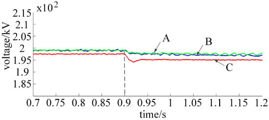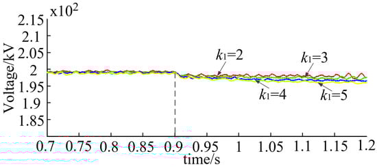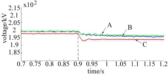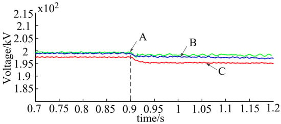 The N-1 operation of the VSC-MTDC system means that after any converter station is removed due to a fault, the rest of the system maintains stable operation. In order to verify the application reliability of the proposed adaptive exponential droop control strategy in the VSC-MTDC system as well as its superiority compared with other droop control strategies, the simulation was set to cut off the VSC1 converter at 0.9 s in order to check the line voltage deviation.