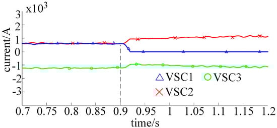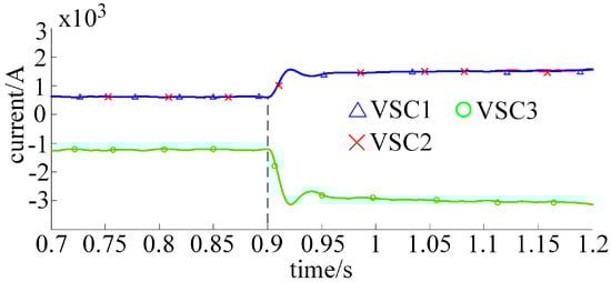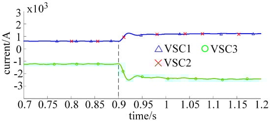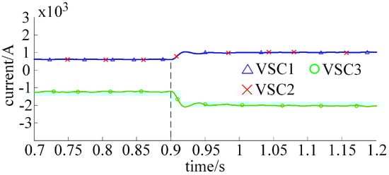As shown in Figure 5, a flexible three-terminal radial DC transmission system was simulated and built, in which two ends were the power-sending ends and one end was the power-receiving end. VSC1 and VSC2 were both rectifier stations, and adaptive exponential droop control was adopted. The rated capacity was 400 MVA, the inverter station was VSC3, the equivalent receiving end load adopted constant active power control, and the converter power was 600 MVA; the DC side voltage was ±100 kV, the line equivalent resistance value was 0.5 Ω, and the line equivalent inductance value was 2 mH.