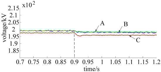 Similarly, the specific DC steady-state voltage values of the three control strategies shown in Table 4 were obtained through simulation, according to the simulation waveforms in Figure 9, Figure 10, Figure 11, Figure 12, Figure 13 and Figure 14; as shown in Table 5, the DC steady-state voltage deviation was calculated, and the proposed adaptive exponential droop control could further reduce the DC steady-state voltage deviation caused by the load power fluctuation, thereby improving the DC voltage quality.