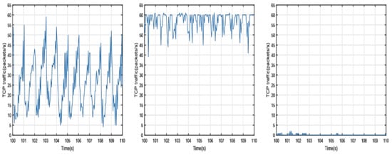 TCP traffic has to go through a mechanism called “steady decline and then steady increase”, while the range of the TCP traffics is much larger, as compared to the normal flow in a network with a limited duration DDoS attack. From Figure 1, TCP traffic was measured with network environments of different scenarios, with a time duration of 100–110 s. The flow of TCP traffic and samples are included in Figure 1.
