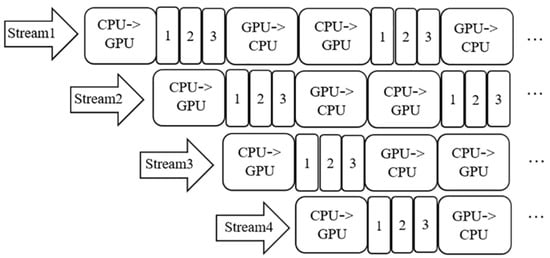 As mentioned above, the use of asynchronous parallel streaming technology in batches allows the computation of one stream to be performed simultaneously with the data copy of another stream, concealing the data copy time and reducing the video memory usage. In order to meet the processing requirements of large data volume, the GPU scheme in this paper changes the range compression and back projection of Figure 1 to an asynchronous streaming structure. The volume of data processed by each stream is very small and is passed back to the CPU when the processing is complete. Therefore, the data transfer time is concealed. The internal process of the back projection kernel in the BP algorithm remains unchanged, and each thread is responsible for calculating the total contribution of that data block to a particular pixel point. The flow of the range compression in asynchronous streams is schematically shown in Figure 2.