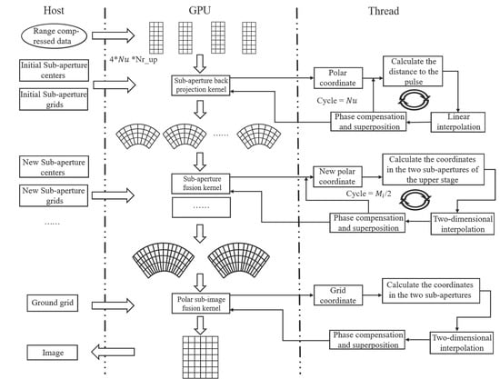 Figure 6 shows a parallel scheme of the FFBP algorithm with a full aperture. The number 2 is chosen as the merge base and  represents the number of sub-apertures at the beginning of the ith round of merging. The FFBP parallel scheme differs from the FBP parallel scheme mainly in the sub-aperture fusion kernel. The FFBP parallel algorithm requires passing the new sub-aperture grids used to merge different levels of sub-apertures into the GPU and releasing the video memory of original sub-aperture grids after fusion. In the sub-aperture fusion kernel, each thread achieves the interpolation and pixel superposition of the same certain coordinate point in all new large apertures in its corresponding original apertures, as expressed in Equation (12). The sub-aperture fusion kernel is called several times until less than  large sub-aperture images are obtained. The final grid imaging is done by accessing the polar sub-image fusion kernel, and the result is transmitted back to the host.