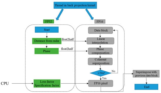 In the FP16 BP scheme proposed in this paper, the range compression for the original echo data is completed according to Figure 2, and the specific implementation flow chart after range compression is given in Figure 7.