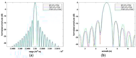The normalized amplitude diagrams in range and azimuth direction of the three CPU schemes for a point target are shown in Figure 10, and the comparison of the peak sidelobe ratio (PSLR) and the integral sidelobe ratio (ISLR) for the point target is shown in Table 3. By comparison, it can be found that the energy aggregation effects are basically the same. The time consumption of BP, FBP, and FFBP schemes in Figure 10 are 30,357,648 ms, 570,969 ms, and 2,140,093 ms, respectively, and the fast time-domain algorithms achieve a good speedup. When there are few aperture divisions, the FFBP computation is larger than that of FBP according to the computational volume derivation in Section 2, resulting in a faster speed of the FBP algorithm.