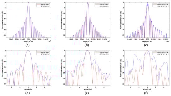 The normalized amplitude diagrams for a point target. (a) BP-GPU-FP32 and BP-GPU-FP16 in range direction; (b) FBP-GPU-FP32 and FBP-GPU-FP16 in range direction; (c) FFBP-GPU-FP32+ and FFBP-GPU-FP32 in range direction; (d) BP-GPU-FP32 and BP-GPU-FP16 in azimuth direction; (e) FBP-GPU-FP32 and FBP-GPU-FP16 in azimuth direction; (f) FFBP-GPU-FP32+ and FFBP-GPU-FP32 in azimuth direction.