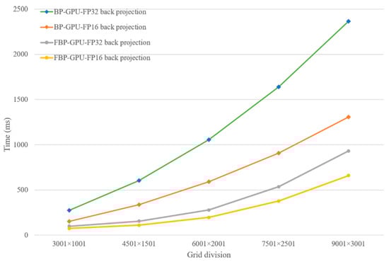 In terms of real-time imaging, the total time and back projection time of the BP-GPU-FP32, BP-GPU-FP16, FBP-GPU-FP32, and FBP-GPU-FP16 schemes for different grid divisions with 3072×1024 data volume are shown in Table 5 and Figure 12, respectively. The back projection of FBP and FFBP algorithms are divided into 2 and 3 kernel functions in Section 2.2 and Section 2.3, respectively. It can be seen that: