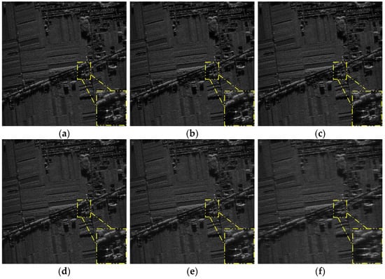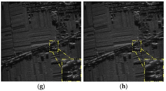 Figure 13 shows the results of the eight schemes for the region of 750 × 750 m2 selected by 0.15 m interval for the experimental data with 3072×4096 data volume, and the local area of the pictures is intercepted and enlarged. The other conditions of the experiment are the same as the above simulation. In Figure 13 the transverse direction is azimuth. It should be noted that whether motion compensation is performed has almost no effect on the image quality of the BP algorithm. In this paper, linear trajectories are used for the imaging processing, and the results in Figure 13 are adjusted for overall contrast for presentation purposes, but the image quality analysis in Section 4.3 is still performed on the original images. It can be seen that the imaging results of FFBP-GPU-FP32 and FBP-GPU-FP16 are relatively worse, which are related to more interpolation operations and low data precision, and the focusing results of other images are not significantly different.