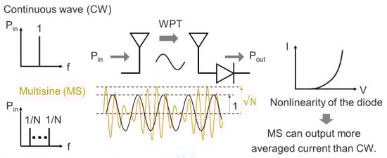 - Boaventura, A.S.; Carvalho, N.B. Maximizing DC power in energy harvesting circuits using multisine excitation. In Proceedings of the 2011 IEEE MTT-S International Microwave Symposium, Baltimore, MD, USA, 5–10 June 2011; pp. 1–4. [Google Scholar] [CrossRef]