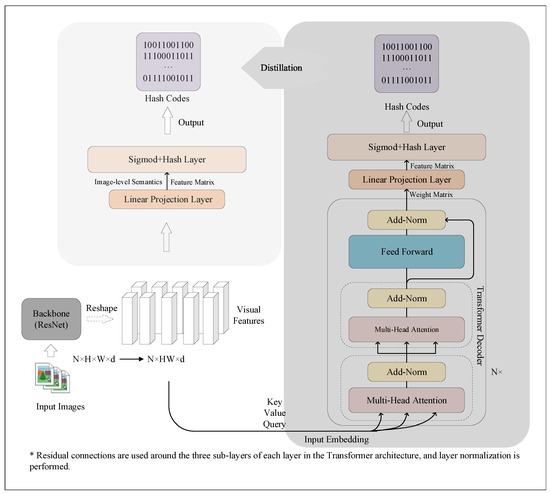 This work first extracts the visual features of the images using a CNN-based backbone. Then, the decoder of Transformer is used to perform the fusion of different image patch features by self-attention. Moreover, the final fused features are mapped to Hamming space to perform more compact hash learning. Finally, the knowledge learned by the Transformer module is distilled into a smaller and faster model.