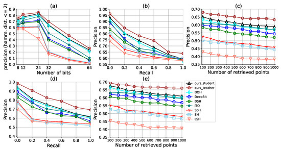 Performance curves of retrieval results on the NUS-WIDE dataset: (a) Precision using hash lookup within Hamming radius 2; (b) Precision–recall curve for 48 bits; (c) Precision curve for 48 bits; (d) Precision–recall curve for 24 bits; and (e) Precision curve for 24 bits.