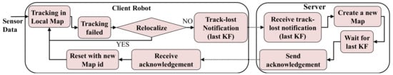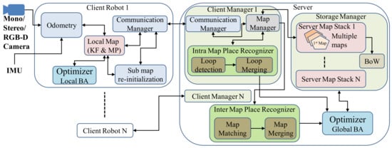 Figure 1 presents the architecture of our proposed framework. Every client robot is equipped with at least one monocular/stereo/RGB-D camera, an IMU (optional), a processing unit, a small memory unit, and a wireless module. The central server contains high-performance computation capabilities along with large storage and wireless communication capabilities. The system configuration does not assume any specific configuration of client robots, so any type of UGV or UAV can participate as a client. If IMU is available, any agent must try to initialize with VIO and continue with VIO if the biases of the accelerometer and gyroscope, gravity direction, and velocities are estimated correctly; otherwise, VO only estimation follows. In this context, we assume that the environment is feature-rich and has sufficient illumination.
