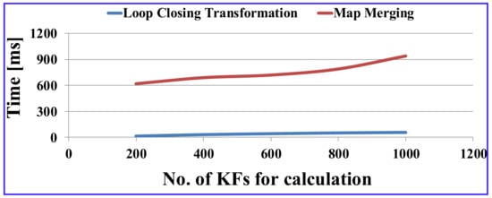 We evaluate CORB2I-SLAM execution on EuRoC MH01 to MH04 sequences. The on-board execution of any client is independent of the total number of participating clients; therefore, the execution time is similar for single and multiple clients. The tracking thread takes on average 36 ms, the mapping thread takes 240 ms to 245 ms, and communication takes about 0.28 ms. Server performance changes with the number of KFs to be processed for an operation. Figure 6 shows the average execution time for computing the transformation for a loop closing and map merging.
