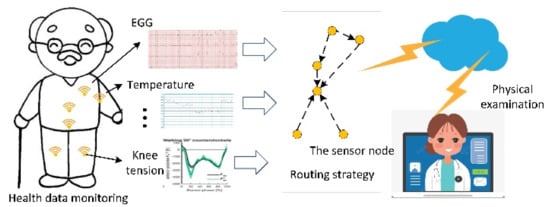 Unbalanced rural medical resources and population aging have promoted research on intelligent health care []. A system that can continuously monitor the health of the rural elderly and share information with remote doctors or hospitals is of great significance to promote livable villages []. The Wireless Body Area Network (WBAN) is a wireless sensor network (WSN) technology. It is composed of interconnected, low-power, intelligent and miniaturized sensors, which transmit health data (temperature, arterial pressure, electroencephalogram signals, etc.) through the wireless medium in or on the human body [].