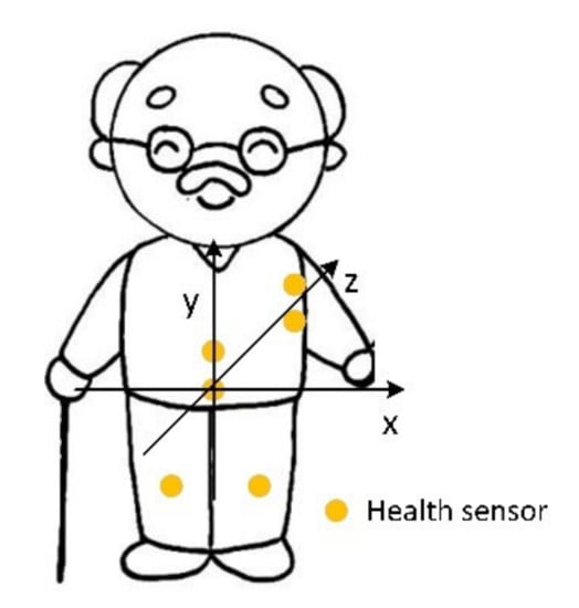 In the environment of Intel®Core™ I7-9700U CPU@3.00 GHz with 16 GB RAM, the algorithm was verified on the MATLAB platform. The deployment location of the WBAN is shown in the Figure 2. To facilitate human action, the sink was placed at the waist. Taking the sink as the origin, the ray parallel to the ground as the X-axis, the ray perpendicular to the ground as the Y-axis, and the ray perpendicular to the X-axis and Y-axis as the Z-axis, a three-dimensional coordinate system of the WBAN for the rural elderly was established.