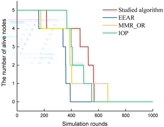 The network lifetime is measured by the number of rounds before a node dies. The fewer the number of dead nodes in a certain period of time, the longer the network lifetime. We compared the studied algorithm with the EEAR algorithm without considering opportunistic routing in ref. [], the MMR_OR algorithm based on maximum/minimum ranges in ref. [], and the IOP algorithm using opportunistic routing to transmit health data, reported in ref. [].