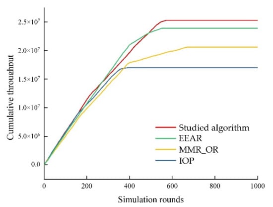 The throughput of the network is an important indicator that characterizes the overall performance of the network. Figure 4 shows the changing trend of the number of packets received by the sink. The throughput performance of the studied protocol was better than that of previous protocols. The energy consumption was more balanced, and the network performance was more stable, which ensured the reliability of data transmission and improved the network throughput. It can be clearly seen in the Figure 3 that the last node of the MMR_OR algorithm died around 650 rounds. The last node of MMR_OR died at the latest, but due to unbalanced energy consumption, other nodes died earlier, resulting in a poor throughput.