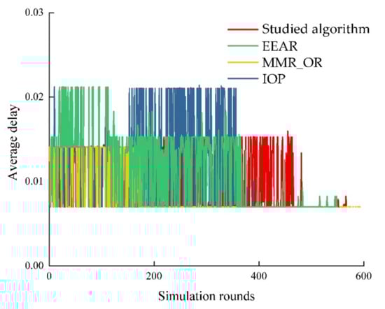 Figure 5 shows the network delay under different algorithms. It can be seen that the delay of our algorithm was shorter than that of other algorithms. This is because the shortest transmission path of emergency data was considered, which made the transmission cost of routing lower. Therefore, compared with other routing algorithms focusing on the transmission distance, the delay of our algorithm was shorter.