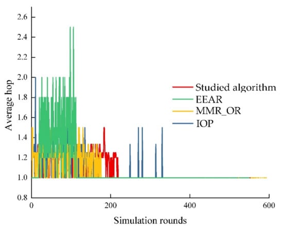 Figure 6 compares the average hops of each algorithm. When the network energy was abundant in the early stage, the studied algorithm chose to transmit data by one-hop transmission. In the later stage, the energy decreased. The influence of residual energy was introduced into the selection of the candidate set, so the average hop count increased. By comparing the average number of hops and the number of dead nodes, it can be seen that the average number of hops experienced by the route selected by our algorithm was small.