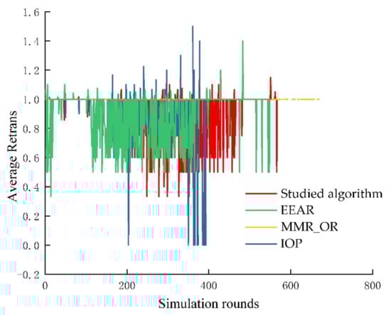 It can be seen from the number of retransmissions in Figure 7 that, as the number of simulation rounds increased, the number of retransmissions increased, which conforms to the transmission law of the WBAN. Compared with other algorithms, the number of retransmissions related to our algorithm was less in the early stage, because the link connectivity probability prediction with a sliding time window could more effectively evaluate the link reliability and realize a more stable data transmission.