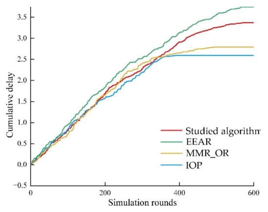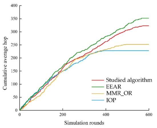 In order to further verify the performance of this algorithm in emergency data transmission, we compared the cumulative transmission delay and the cumulative average hops of the four algorithms for emergency data. As shown in Figure 8 and Figure 9, the cumulative delay and hop of emergency data in the EEAR and MMR_OR algorithms were kept at a low level. These Figures show the cumulative delay and the cumulative hop in the whole simulation round. In Figure 3, all sensors in the EEAR algorithm died early. Most of the nodes in MMR_OR also died in about 400 rounds. Therefore, it is reasonable that its cumulative delay and hop were small. However, too many nodes dying early would not allow the stable monitoring of human parameters and will lead to high equipment costs. It can be seen that when the number of alive nodes was in about the same range (before 380 rounds of simulation), the cumulative delay of our algorithm was small, and we could select a transmission path with fewer hops for emergency data. The studied algorithm could maintain the network stability while considering the emergency data.