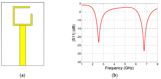 The proposed antenna configuration is shown in Figure 1. The initial design is based on the conventional rectangle monopole antenna shown in Figure 2a using a low-cost FR4 substrate that has a dielectric constant of 4.3, loss tangent of 0.025, and height of 1.6 mm. The FR-4 substrate is solid and not flexible, which is needed in the design. In addition, it has a higher value of that leads to a more compact size and wider bandwidth. In addition, this type of substrate is considered as a low-cost material compared with other types of substrates but still, there is some dissipation that appears at higher frequencies which make an effect on the bandwidth. The radiating element of the antenna is at the top side of the substrate, and a partial ground plane is at its rear side. A microstrip feed line of 50 Ω characteristic impedance is used to ensure a good impedance matching. The performance of the design is assumed according to the following metrics: the three bands of the proposed antenna should have reflection coefficient values less than −10 dB, gain values above 0 dBi, and radiation efficiency values above 50% with omnidirectional patterns that ensure a good coverage for IoT portable applications. Moreover, the bandwidth for each band is considered with a threshold reflection coefficient value of −10 dB. The overall size of the proposed antenna is 33 mm × 22 mm, and the initial values of the parameters are given in Table 1. The reflection coefficient response of the initial design is shown in Figure 2b. The conventional design equations in [26] are used for the initial microstrip antenna at a center frequency of 3 GHz. The antenna length is then reduced to because the microstrip antenna is converted to a planar monopole antenna by the partial coverage of the ground plane [26].