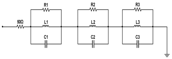 The usual way to resonate multiple frequencies that are adopted in this work is by adding parasitic elements. Finally, to generate the third band, another half ring of 0.53 mm thickness and 5.5 mm away from the first ring is added. This element ensures the appearance of the third resonant frequency at 5.8 GHz with −29.616 dB reflection coefficient as shown in Figure 5a,b. It is clear from the design steps that the surface current distribution is changed on each step so that it causes the generation of additional resonant frequencies. The equivalent circuit of the antenna according to [27] is shown in Figure 6 where R1, L1, and C1 represent the parameters that generates the first resonance frequency 2.4 GHz. R2, L2, and C2 are for the generation of the second resonance frequency 3.7 GHz. Finally R3, L3, and C3 represent the elements that are responsible for the generation of the third resonance frequency 5.8 GHz. These parameters are calculated by using the following equations with respect to the three resonant frequencies [28].