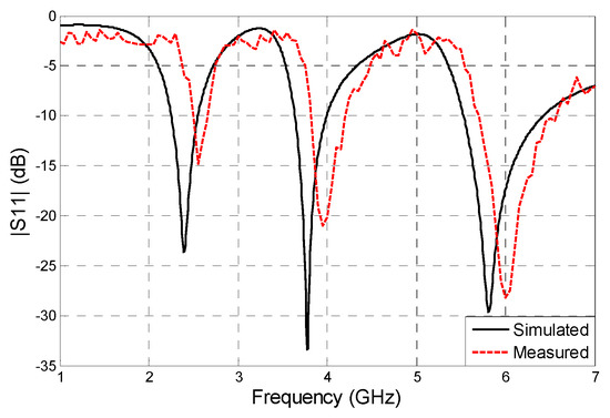 - Pei, J.; Wang, A.G.; Gao, S.; Leng, W. Miniaturized triple-band antenna with a defected ground plane for WLAN/WiMAX applications. IEEE Antennas Wirel. Propag. Lett. 2011, 10, 298–301. [Google Scholar]